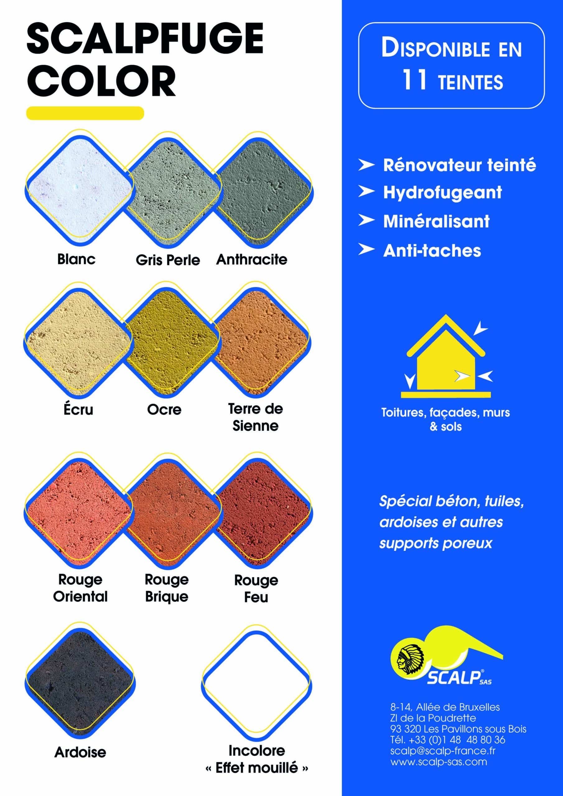 Discover SCALPFUGE COLOR, our water-repellent, mineralizing and stain-resistant renovator specially designed for roofs, facades, walls and floors. With a choice of 11 shades, this unique product deeply permeates the surface, gives it an elegant shade and consolidates it for enhanced protection.