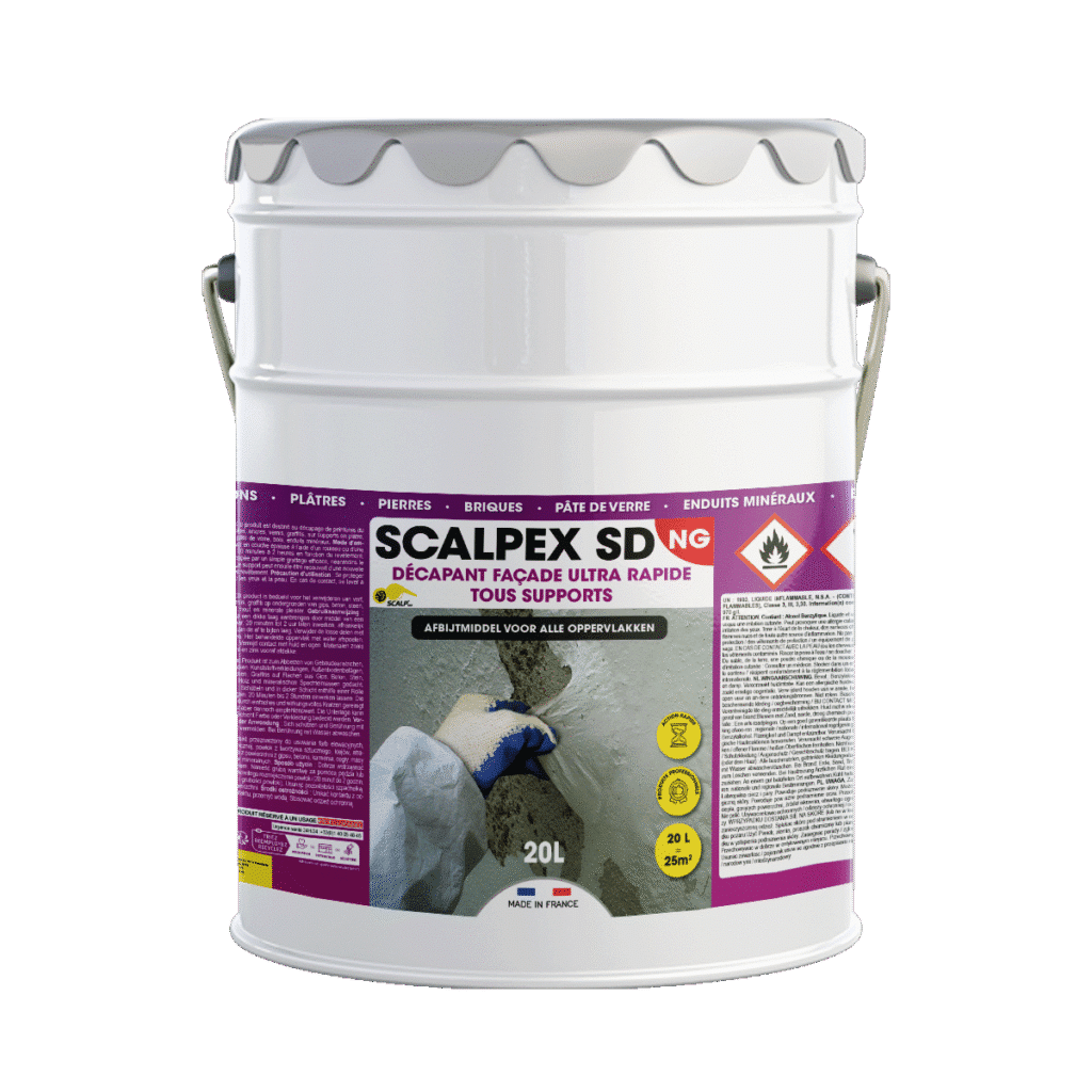 Découvrez SCALPEX SD NG, notre super décapant façade ultra rapide. SCALPEX SD NG vous donne la possibilité de réaliser un décapage efficace et rapide des Imper, des RPE, des films minces, des colles, des encres et des vernis sur un grand nombre de supports tels que le plâtre, le béton, la pierre, la brique, la pâte de verre, le bois et les enduits minéraux.